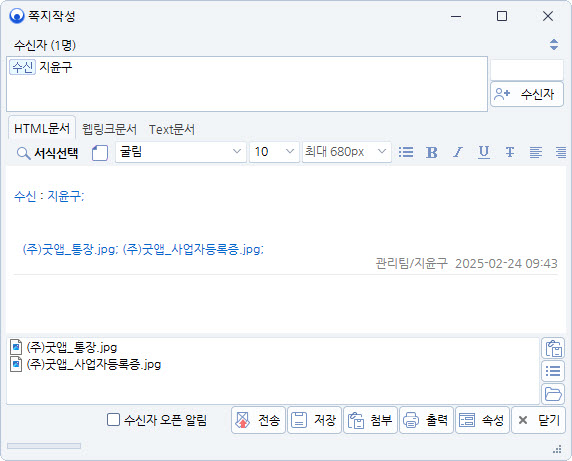 선택된 사용자(부서)가 수신자로 지정되고 파일이 첨부된 상태로 쪽지작성 윈도우가 오픈됩니다.